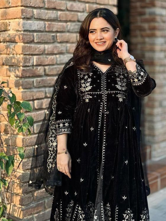 Luxe Black Velvet Embroidered Dupatta Set