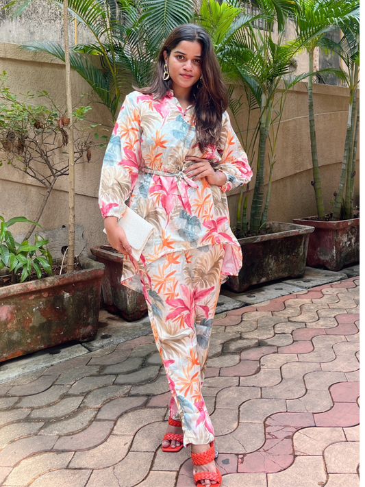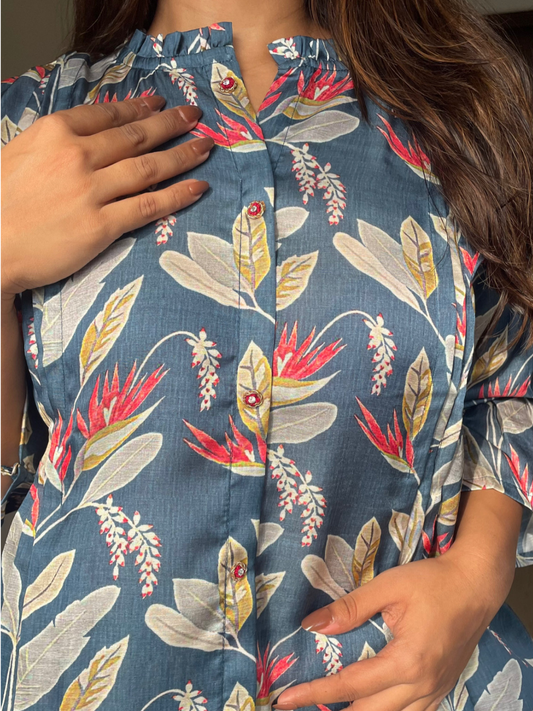 Blue Floral Cotton Co-Ord Set with waist tie up