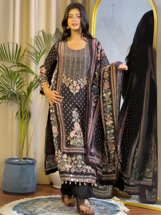 Sale TrendingMidnight Bloom Black Muslin Dupatta Set