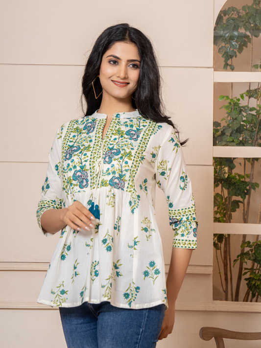 White Boho Chic Floral Print Top