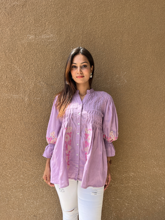 Sold out Bestseller NewLavender Button-Down Tunic with Floral Embroidery