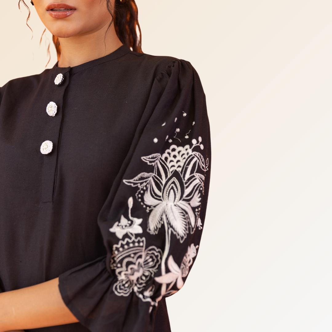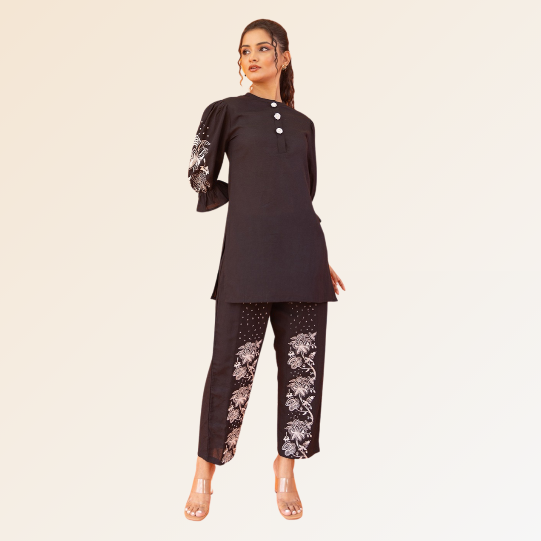 Effortless and chic in black: This trendy co-ord set combines sophistication and comfort seamlessly. The contrast white embroidery on sleeves and pants adds a stylish touch, complemented by smart buttons on the top for a show-stopping look. Crafted from breathable soft fabric, the ensemble features puff sleeves for a fashionable flair and convenient pockets with elastic in the pants. Embrace the perfect blend of style and ease.