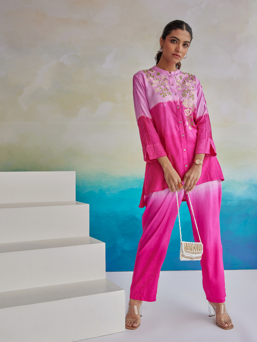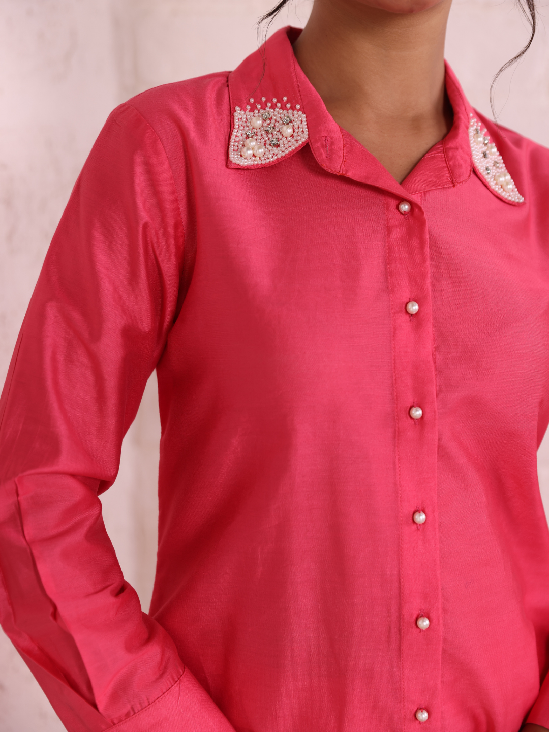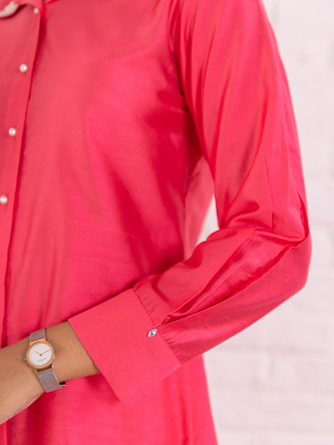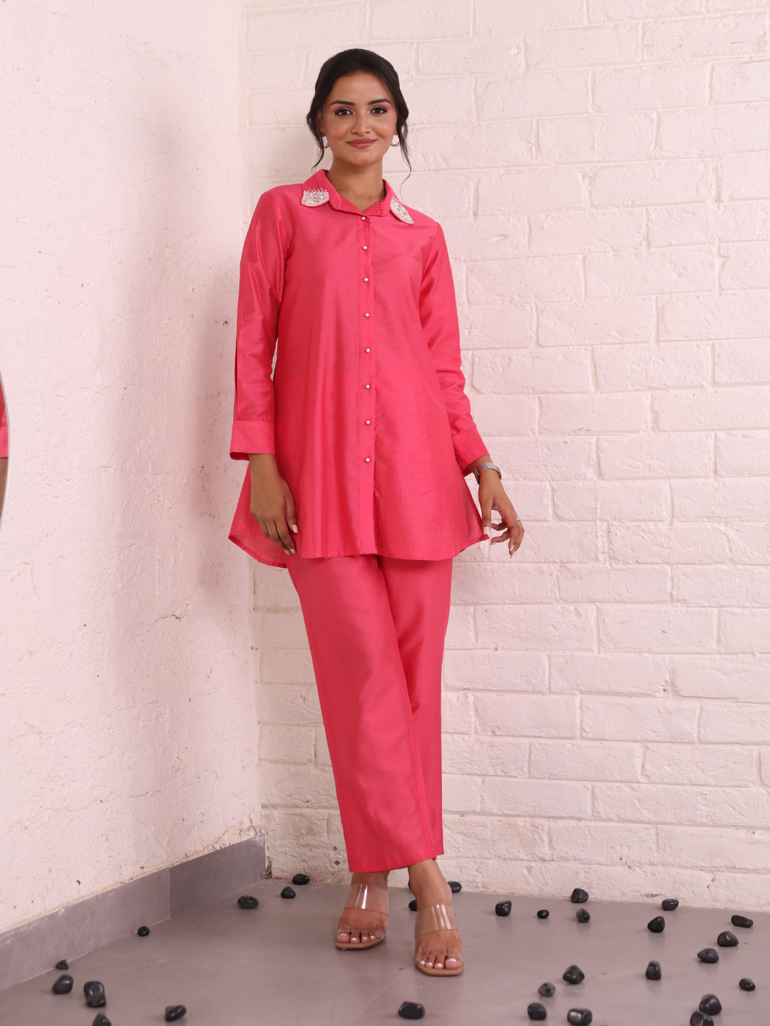 Elevate your wardrobe with this vibrant coral co-ord set, designed for the modern woman who values both style and comfort. This eye-catching set includes a long-sleeve top featuring a button-down front and a unique embellished collar that adds a touch of sophistication. The top's relaxed fit and high-low hemline ensure ease of movement while maintaining a chic silhouette.
