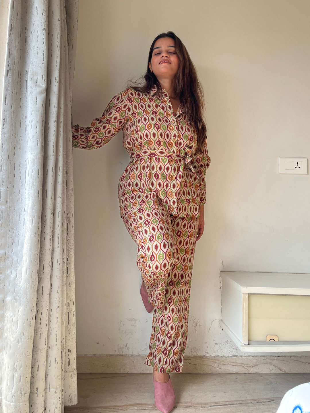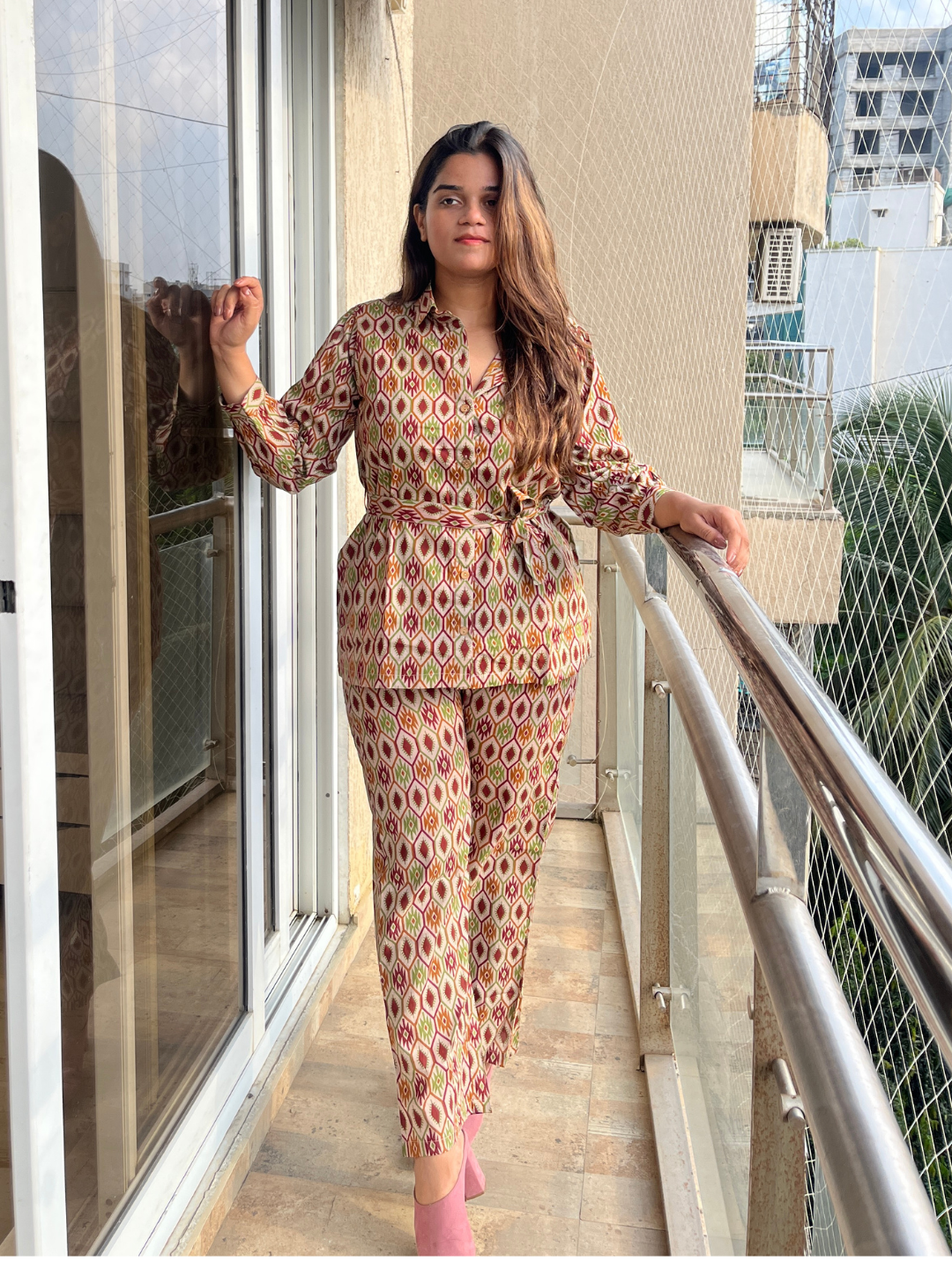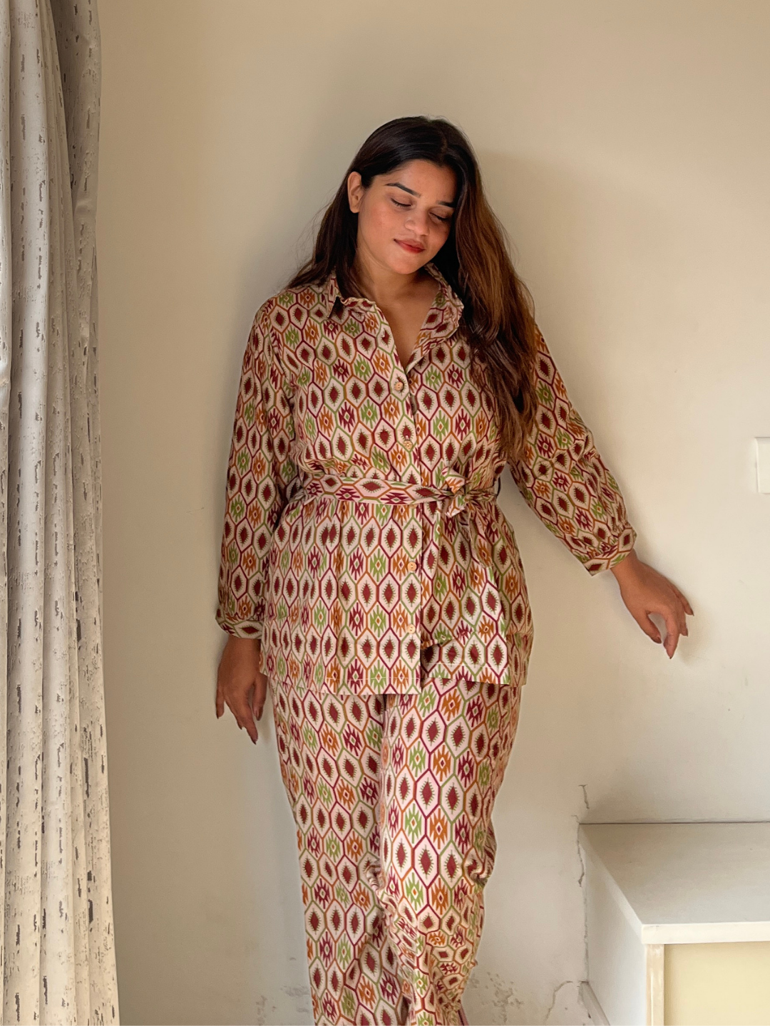Embrace the charm of this dark beige cotton co-ord set featuring a honeycomb print in bold colours that makes a statement. The collar and straight fit exude sophistication, while the matching belt adds a stylish fit. Comfort meets fashion with elastic pants and a convenient pocket.