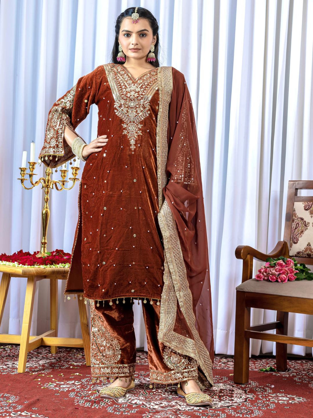 Turn heads in this luxurious velvet palazzo set featuring intricate heavy embroidery, rivet moti embellishments, and fancy coin latkans for a regal touch. The velvet palazzo mirrors the same ornate craftsmanship, while the georgette dupatta with a lace border and rivet moti work adds a graceful flow. Perfect for festive occasions and weddings, this opulent ensemble is available in 9 stunning colours.