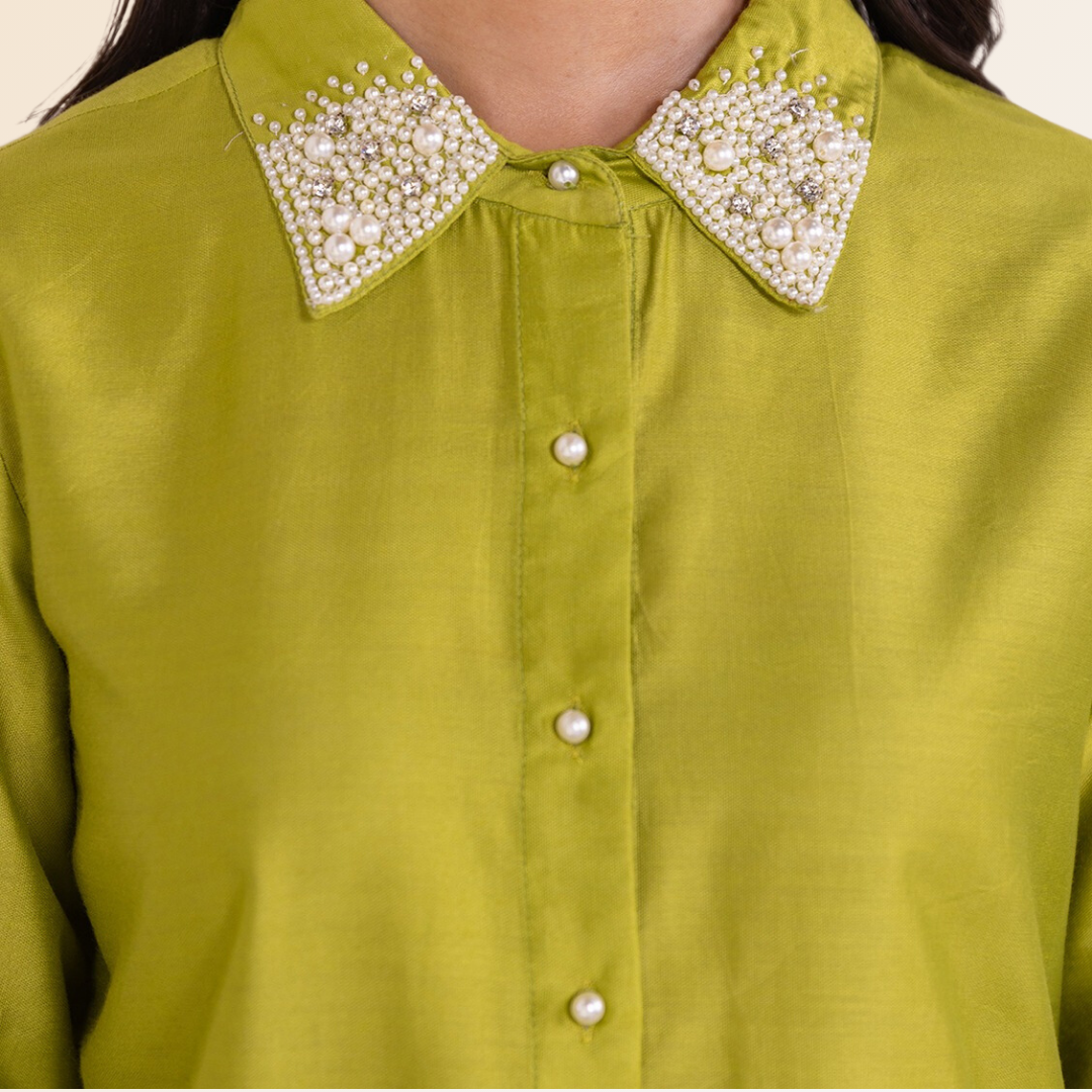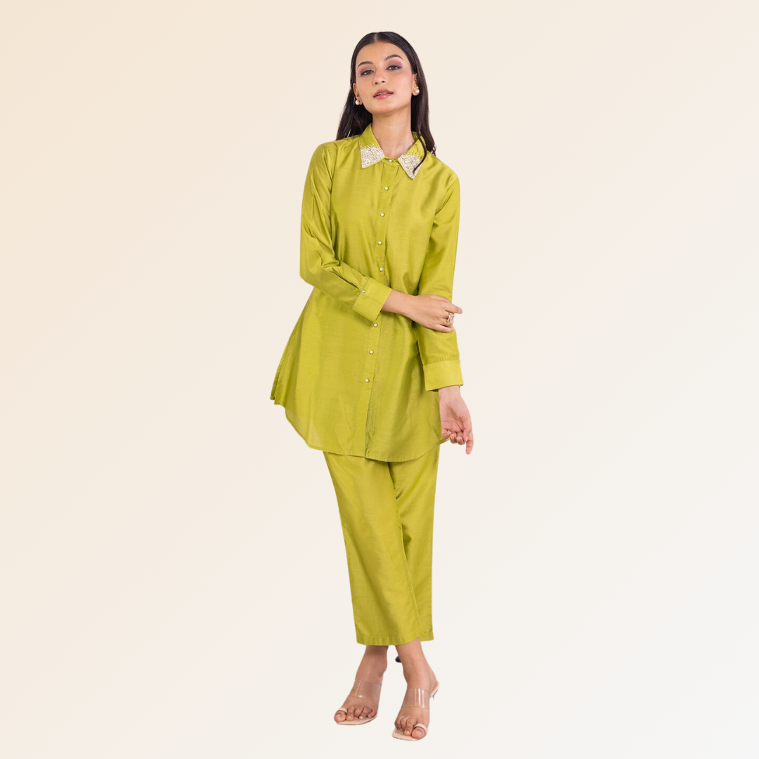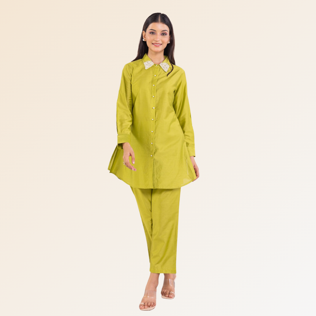 Elegance in every stitch: This parrot green co-ord set is the epitome of sophistication, with its pearl buttons and intricate pearl embroidery on the collar. Perfect for parties, the set combines style and comfort seamlessly. The matching pants, complete with pockets and elastic at the back, ensure you can dance the night away in grace and style.