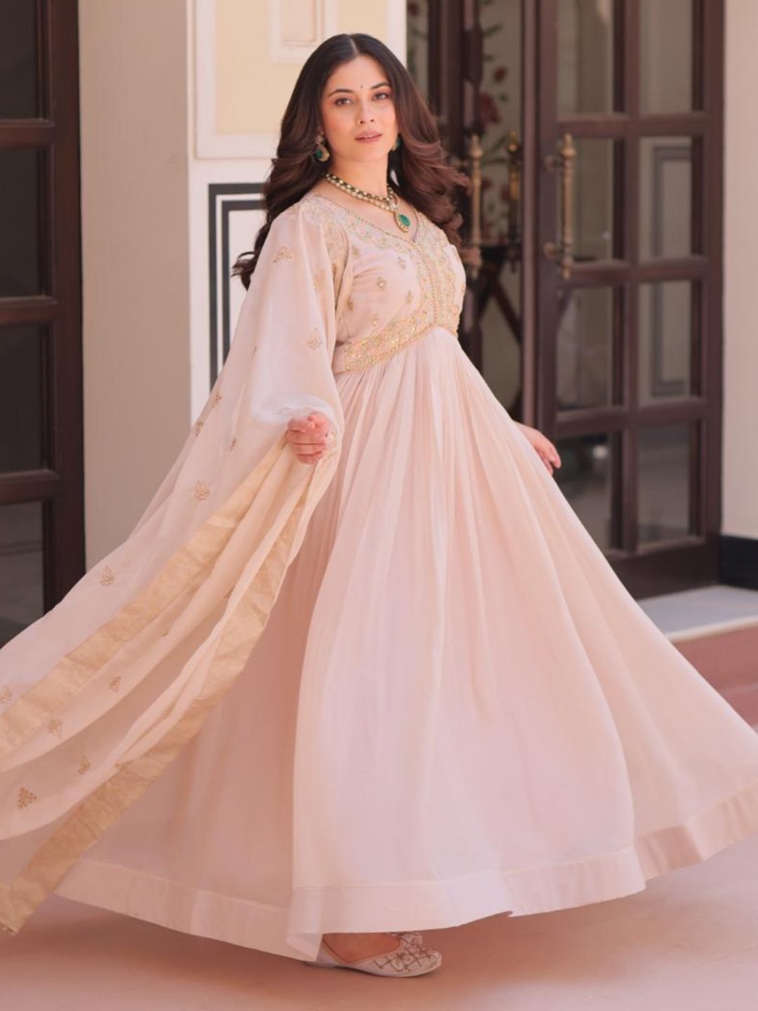 A dreamy georgette gown adorned with delicate bead and sequin embroidery on the yoke and sleeves, paired with a matching embroidered dupatta. Fully lined for comfort and effortless movement, this flowy silhouette blends elegance with subtle festive sparkle—perfect for mehendi, day weddings, and festive celebrations. Available in two serene shades.