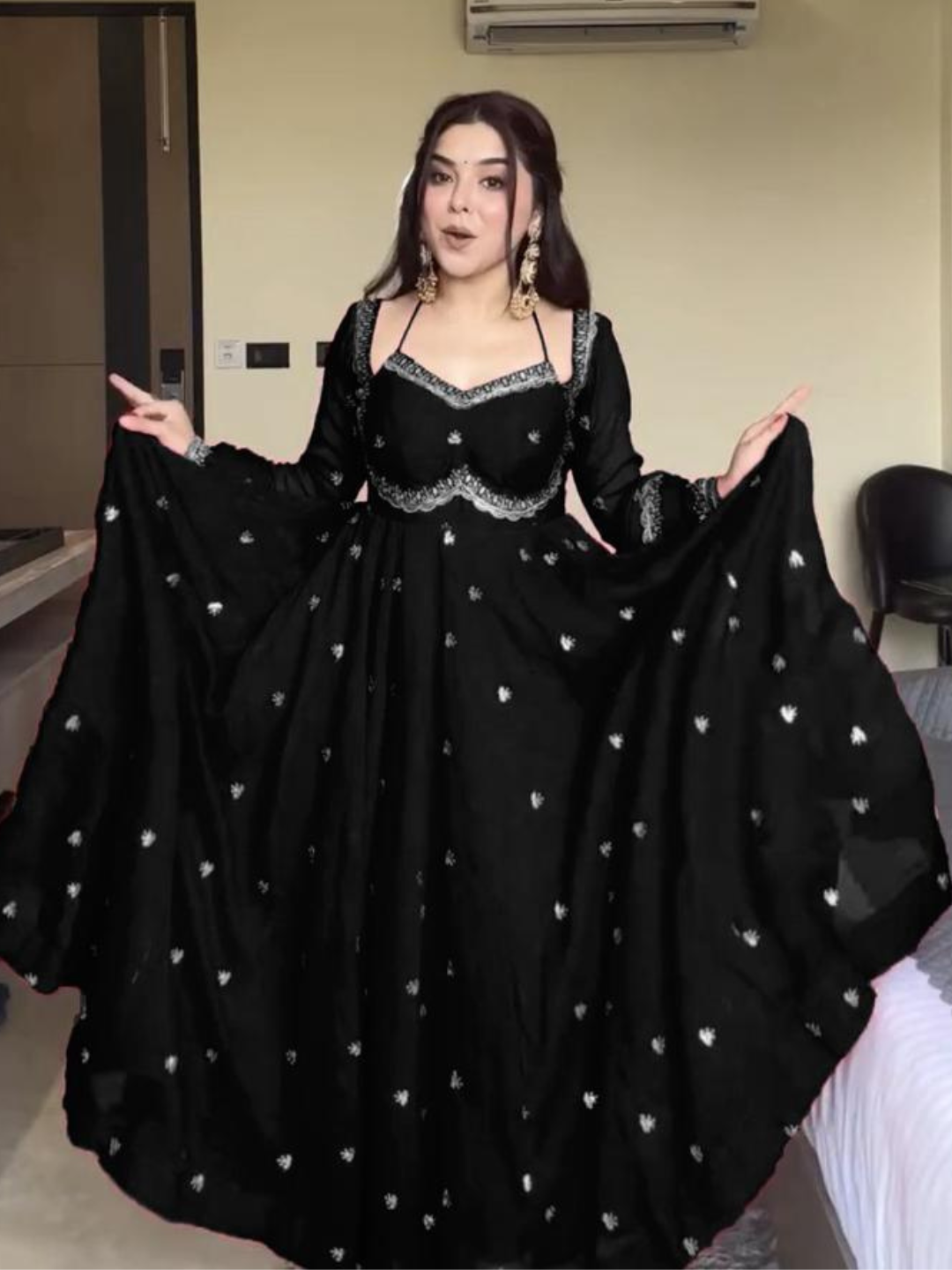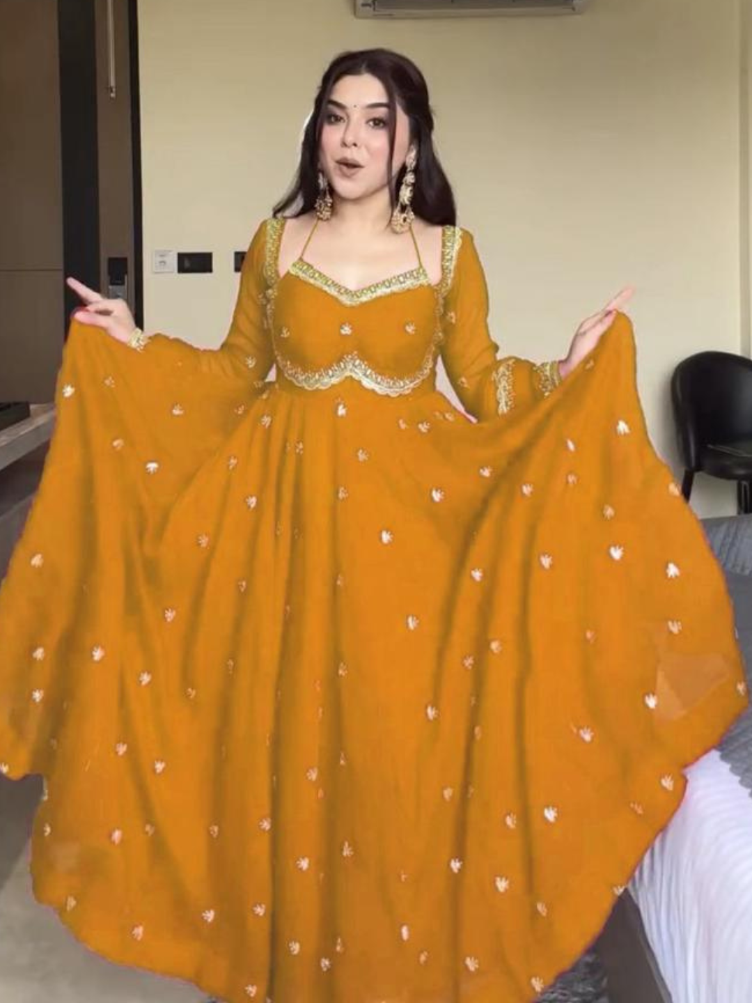 Turn heads this festive season with our exquisite Georgette Anarkali, crafted to perfection for every celebration. Featuring delicate all-over embroidered detailing and a flattering silhouette, this ensemble is as comfortable as it is captivating. The outfit is thoughtfully lined with soft micro cotton, ensuring breathability and ease of wear throughout your event.